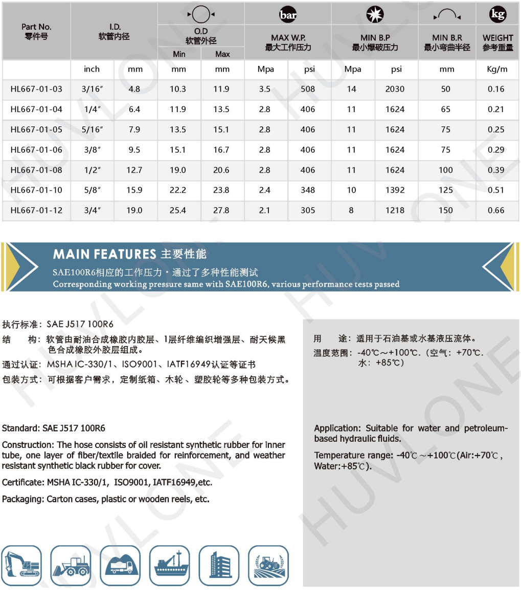 SAE J517100R6單層纖維編織橡膠液壓軟管