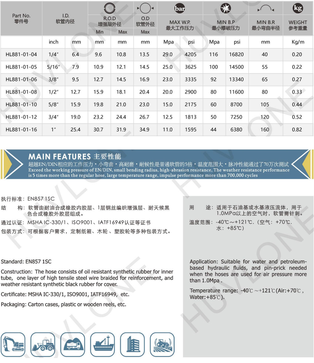 符合/超越DIN EN857 1SC一層鋼絲編織橡膠軟管