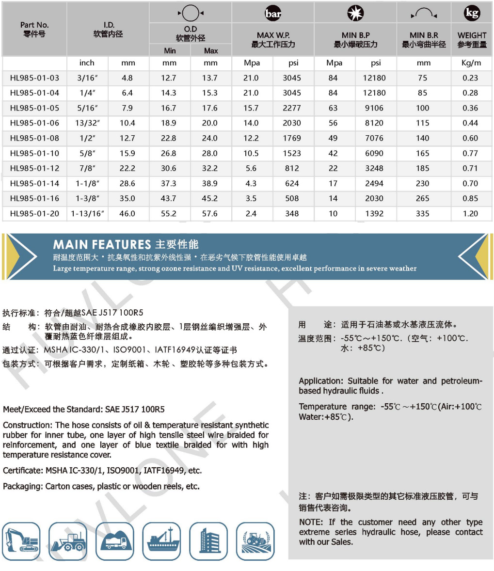 符合/超越SAEJ517100R5單層鋼絲編織層、織物外覆層的耐高低溫液壓軟管