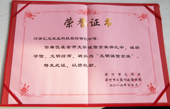 為培育和踐行社會主義核心價值觀,不斷提高公民道德素質和社會文明程度,積極營造文明、誠信的社會環(huán)境,漯河市文明辦、漯河市工商局在全市開展“文明誠信企業(yè)、文明誠信商戶”的評選活動,通過有關部門層層嚴格把關、逐級推薦,河南匯龍液壓科技股份有限公司獲得了“2016年度文明誠信企業(yè)”的榮譽稱號。